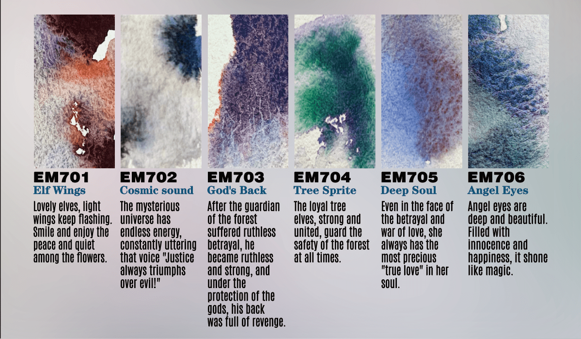 Charm 1 contiene  colores inspirados en la naturaleza con personalidad ya que cada uno cuenta una historia en cada nueva pincelada, al descomponerse en subtonos 8 (duo y tritonos) entre más agua usas otorgando inspiración infinita y sorpresa en tu creación. Estos colores han sido producto de arduo estudio de color y desarrollados por profesionales de la industria del color y pigmentos profesionales en Canada. Cada color contiene al interior de el set una historia y nombre con lo cual se inicia la magia inspiradora de crear arte en una nueva acuarela.